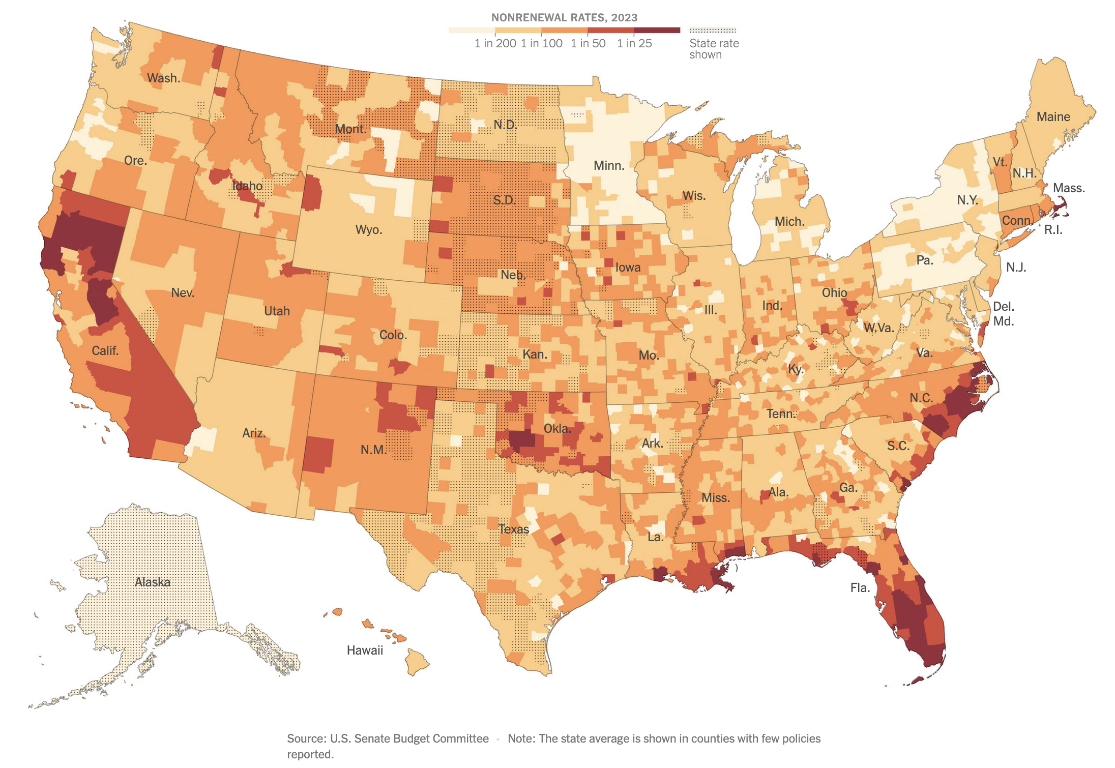 This map, from the Senate Budget Committee via this New York Times article, shows homeowner’s insurance nonrenewal rates in 2023. Red areas are those where over 1 in 25 policies were not renewed in that year alone. These are places insurers are exiting. They line up with areas at risk of hurricanes, wildfires, drought, and other disasters expected to worsen.